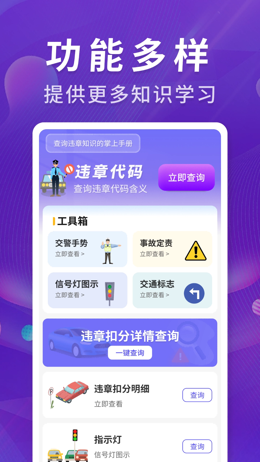 违章全国查,这款全国违章查询功能实用且功能多样,不仅能让用户学习全面的交通知识,还可以查询违章代码,从而清楚了解各类违章代码的具体含义。另外,它还了违章知识学习模块,有助于用户积累实用的交通安全常识。除此之外,借助事故定责图解功能,用户能够直观地学习事故责任判定的相关知识,进而增强安全意识和应对能力。