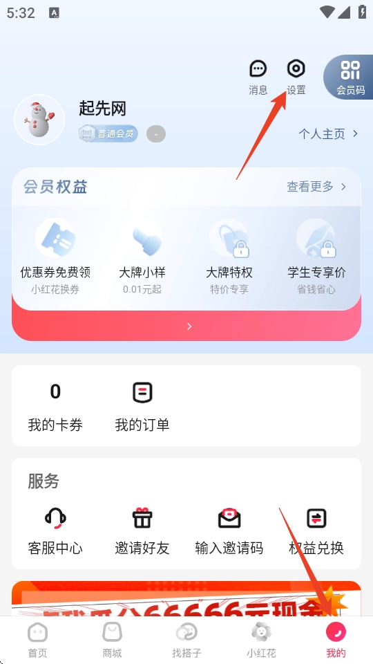 打开天猫校园应用,点击页面底部的【我的】选项,接着点击右上角的【设置】按钮。