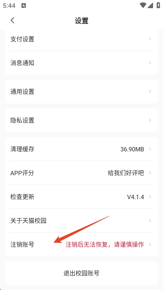 打开天猫校园应用,点击底部导航栏的【我的】选项,接着点击页面右上角的【设置】按钮,进入设置界面后向下滑动至页面底部,最后点击【注销账号】选项。