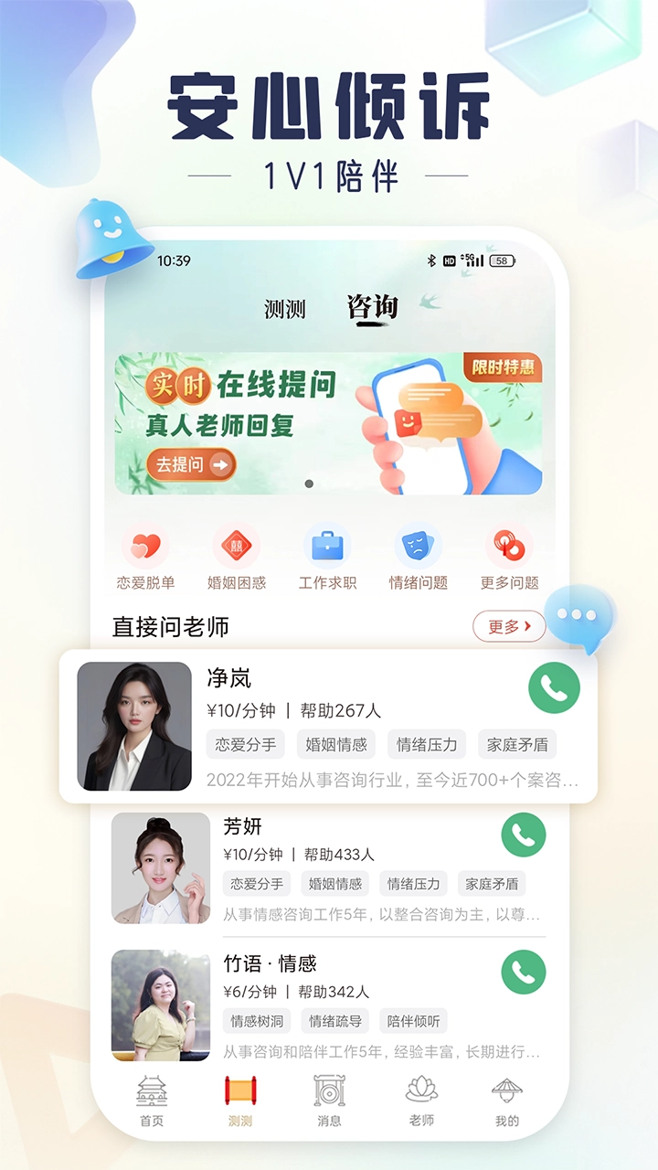 恋爱感情遇到困扰不用慌,在线帮您解决爱情、学习、事业、财富等方面的问题。