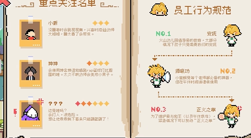 午休时间到是B站UP主“火山哥哥”自制的一款趣味休闲像素风游戏。在游戏里,玩家将化身为幼儿园老师,在午休时段照看一群活泼可爱的小朋友,助力他们安稳入眠。游戏过程中会出现小朋友乱扔玩具、哭闹、乱爬等各类突发状况,玩家得灵活处理这些情况,以维护午休时的秩序。