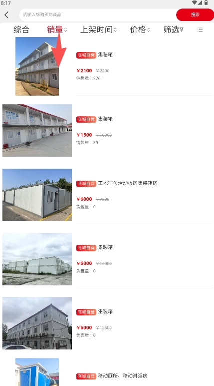 进入商品列表后,选择目标商品如“集装箱”。