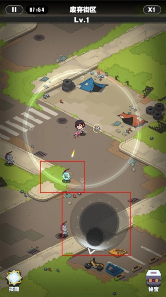进入关卡后,玩家需借助轮盘操控角色移动,角色周边的白圈是视野范围,当僵尸靠近该圈时,角色便会自动发起攻击。