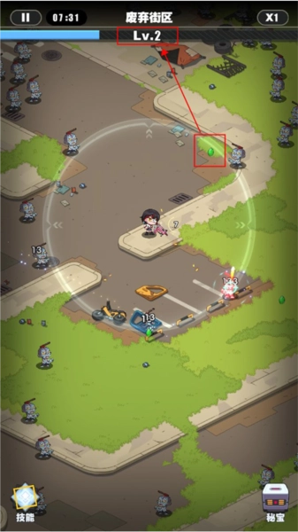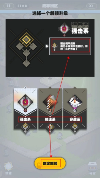 角色等级通过拾取经验球提升后,便能解锁技能学习。玩家只需点击,就能查看各技能的具体效果,在此建议优先选择子弹类技能。
