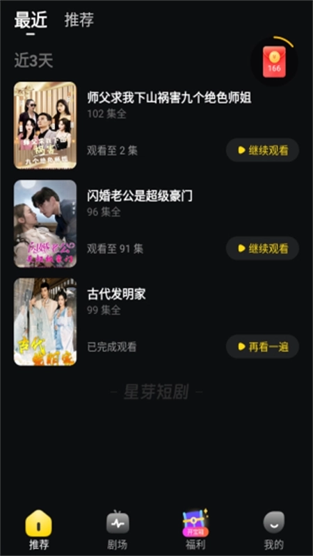 1、星芽短剧的观剧历史记录会出现在两个位置,分别是“最近”和“历史”板块。该平台无需登录即可免费观看全集短剧,这种情况下也会生成观剧记录,但这些记录仅会保存在“最近”里,且不支持手动删除操作。