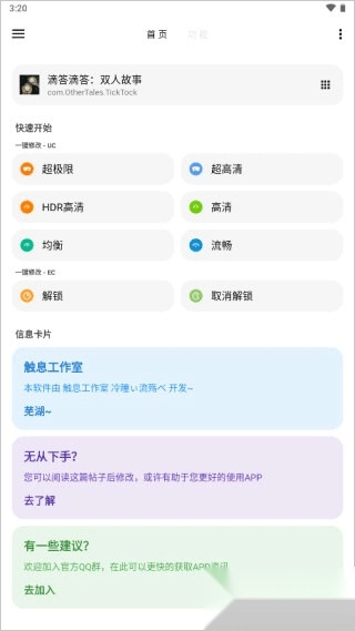 安装LT画质助手并进入后点击图示位置,可进入切换界面,还能修改应用软件,用户可选择需要修改的内容,如修改ticktock的游戏画质,可使用首页功能一键修改。