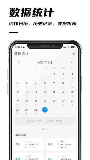 多维度数据统计:记录每日写作时长、字数与速度,并通过日历形式直观展示,助你清晰把握个人创作节奏。