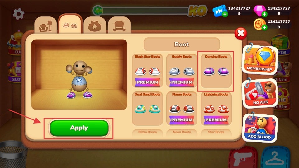 2、在服装界面选【DancingBoots】,点击【Apply】给木偶换装,改变外观或提升能力。