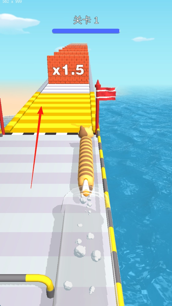 进入冲刺阶段(红箭头指示),朝着倍数墙(×1.5)全力进发,借助叠加猫咪的力量撞击突破,冲过终点旗即可完成当前关卡,进而解锁全新地图。