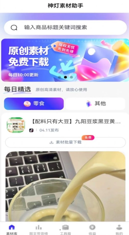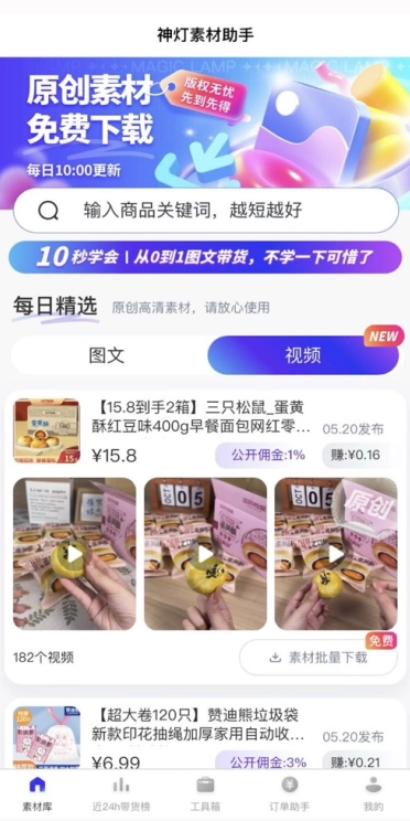 神灯素材助手,是专为图文及短视频带货达人打造的一站式图文创作工具,不仅拥有海量免费原创高清素材,还配备实用的图片处理功能,堪称图文带货达人的贴心帮手。
