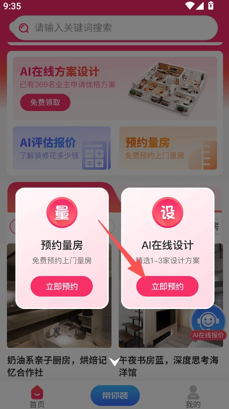 覆盖装修全流程,从AI在线设计、预约量房到施工类型选择,构建从设计到施工的完整服务体系,满足装修各环节需求。
