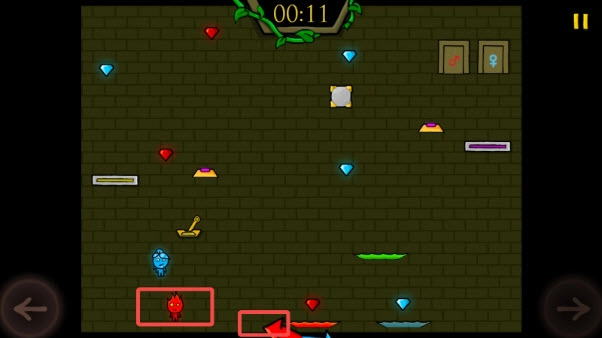4、注意水女孩和火男孩只能碰到自己属性的物体,如水女孩是水属性,如果碰到了火,游戏就会失败。