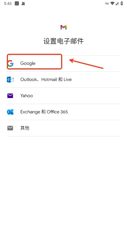 在设置电子邮件界面,点击“google”;