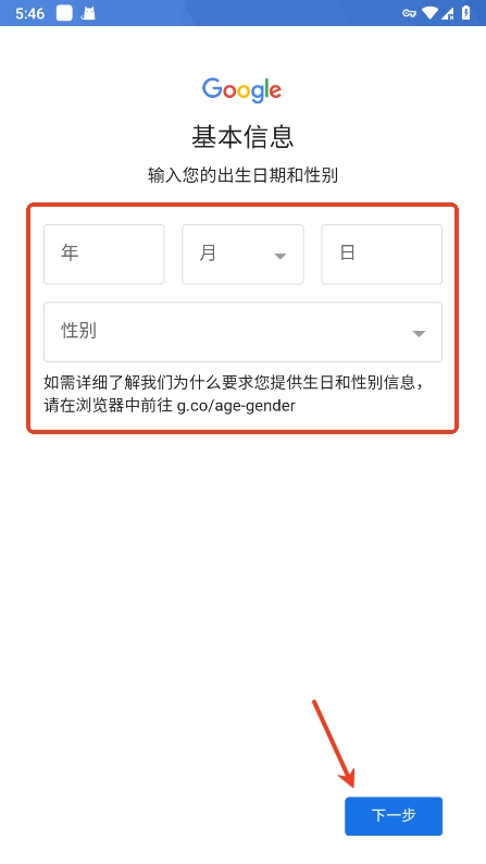输入出生年月日和性别,点击“下一步”;