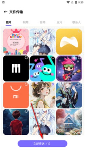 在其中一部手机上点击【我要传送】按钮,进入文件列表界面后,勾选需要传输的资源。