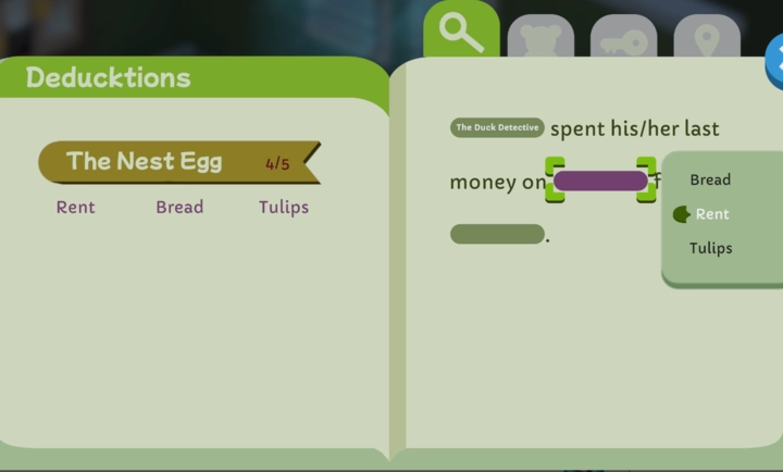 鸭鸭侦探,其英文名为Duck Detective。在这款游戏里,玩家将化身一名优秀的侦探,要凭借出色的推理能力去探寻案件的完整真相。为此,玩家需要找寻更多线索,并且可以通过凝视的方式让每个人承认自己的错误。游戏包含大量案件,玩家需要逐个去解决。