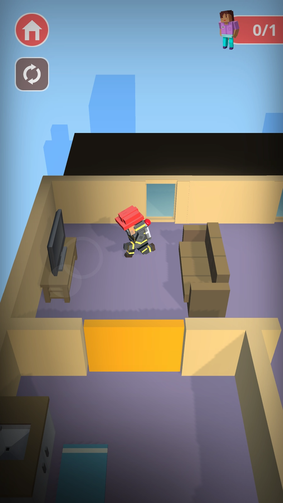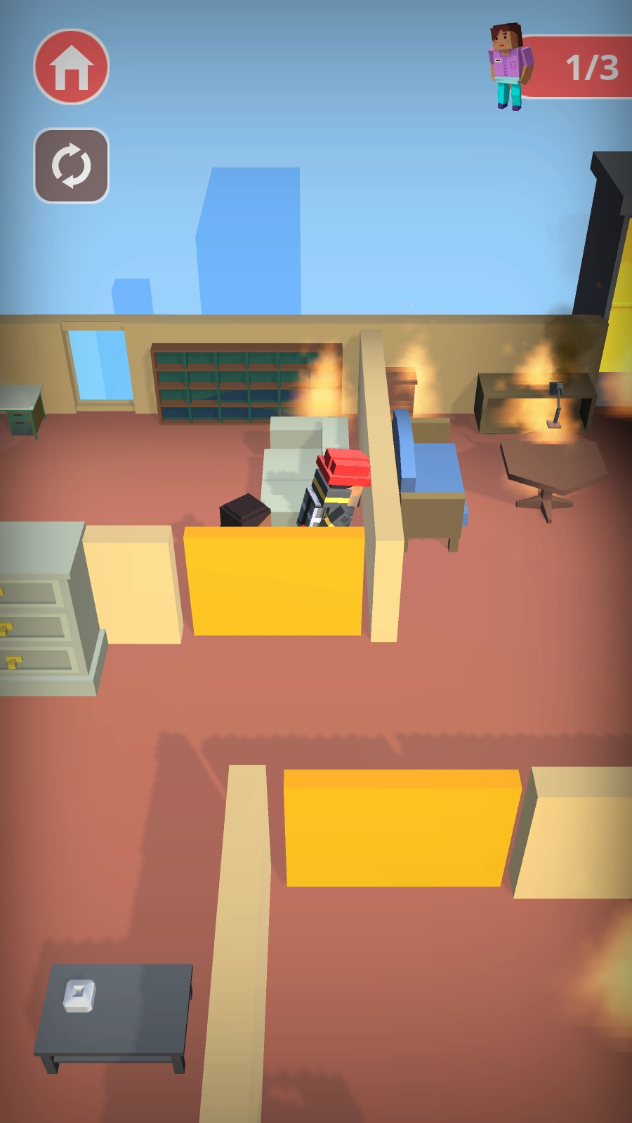 火源引流与安全解救:通过操控障碍物引导火源流向非居民区,消除市民周边的火海威胁,迅速定位被困人员并将其带离危险区域,达成当前关卡的救援任务。