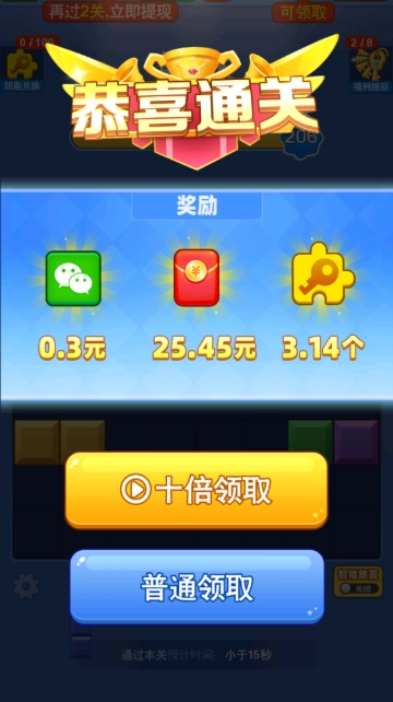 当我们通过消除操作成功达成关卡要求的目标分数后,就能顺利通关并领取相应奖励了。