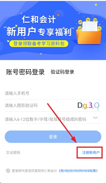 打开仁和会计课堂,进入登录界面后点击注册新用户