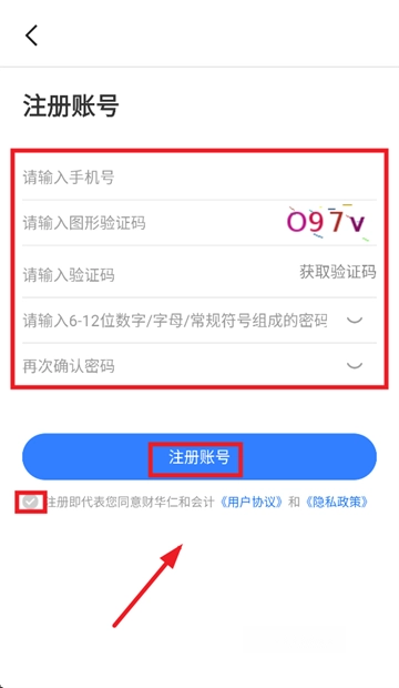 在账号注册页面,依次填写手机号、图形验证码、短信验证码与密码,勾选“注册即表示同意财华仁和会计《用户协议》及《隐私政策》”后,点击“注册账号”按钮即可完成操作。