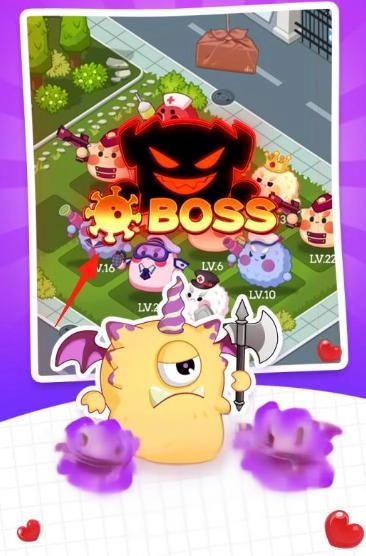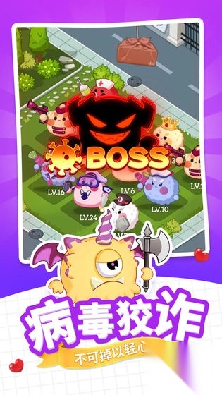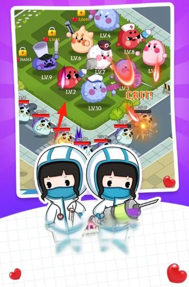 怪物养成玩法聚焦“病毒”主题的萌趣怪物(像LV.2的粉色怪),玩家可借助战斗(触发暴击“CRIT!”)来让怪物提升等级(如LV.10)。