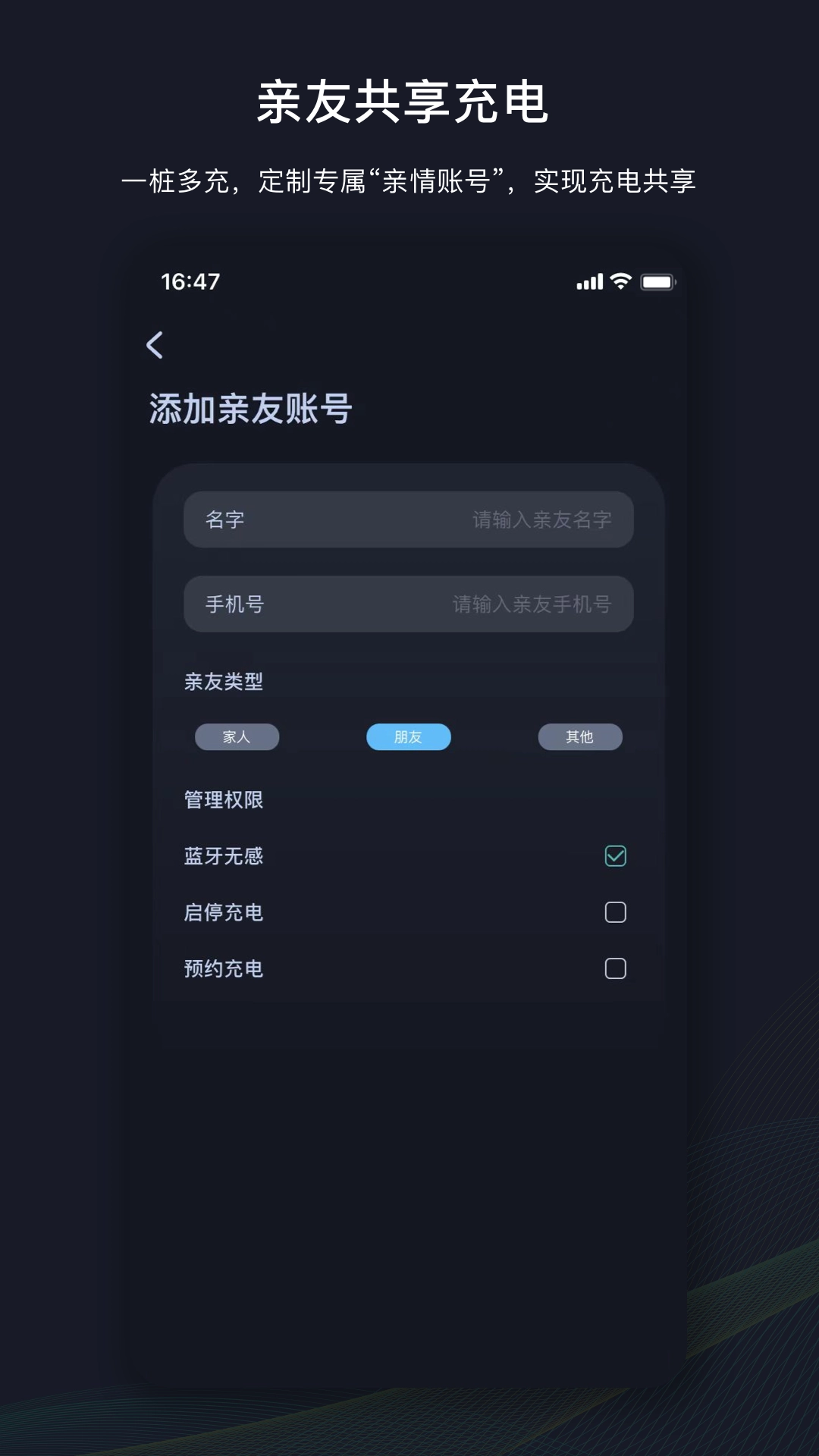 【亲友共享】桩主能为家人设置专属“亲情账号”,方便与家人一起共享充电服务。