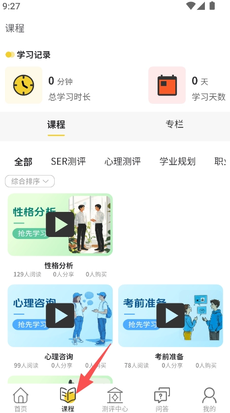课程分类细致清晰,SER测评、学业规划等内容分类展示,方便用户快速找到所需的学习内容。