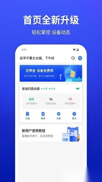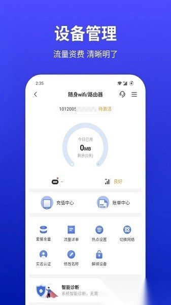 这是一款融合设备管理与在线充值功能的应用,用户能快速完成卡片绑定与认证;可对路由器、随身WiFi、流量卡等多种设备实施统一管理,还提供流量查询、套餐订购、设备租售及在线客服等一系列实用服务。