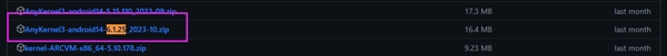 首先在github上找到与你设备内核版本一致的AnyKernel3包。例如,小米14Pro的内核版本是6.1.25-android14,你需要找的是版本号与之相同、且名称开头带有AnyKernel3的包。