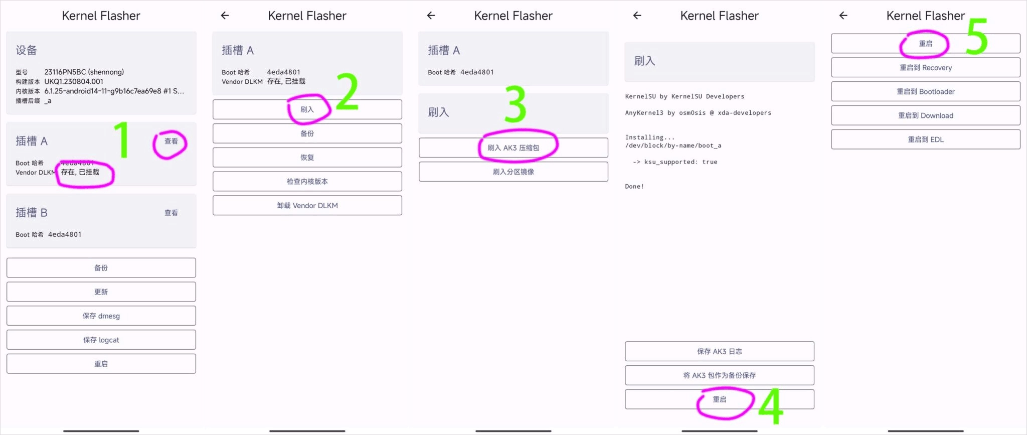 查看已挂载的插槽,接着执行刷入操作,先刷入AK3压缩包,待刷入成功后重启设备,重启完成即可成功完成刷入流程。
