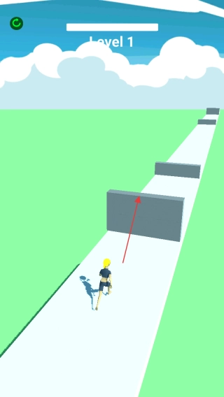 游戏开启第一关,玩家操控的角色会在跑道上自动向前奔跑,逐步靠近前方的障碍物。