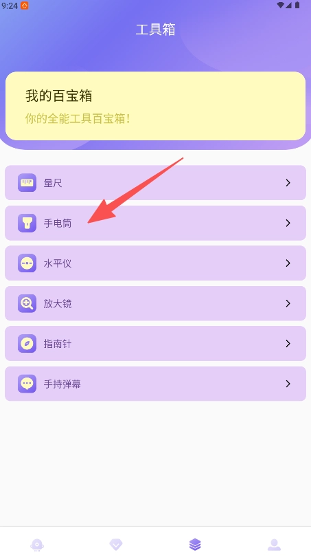 你可以在“我的百宝箱”里找到“手电筒”功能图标,然后点击它。