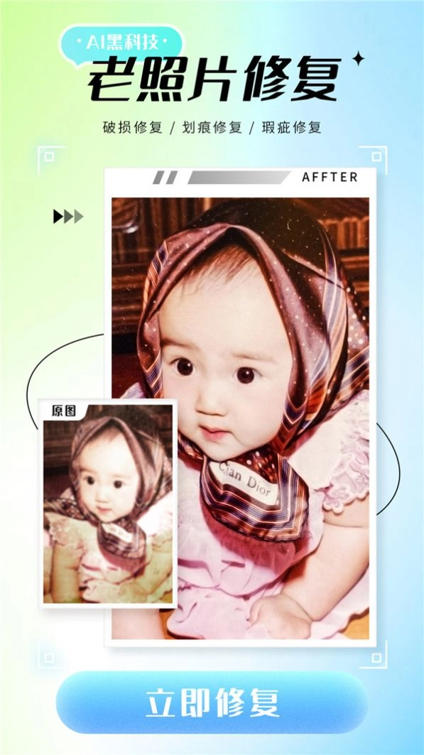 诗顺照片修复仪是一款能很好满足用户需求的照片编辑服务软件,用户可将自己的老照片全部上传到客户端进行修复,它采用了更先进的渲染技术,让修复后的老照片更具生机感,具体操作方式十分简单,还支持多种格式的照片修复,修复完成的照片在清晰度和色彩感上都有提升,对于黑白照片也提供上色功能。快来体验一下吧!!