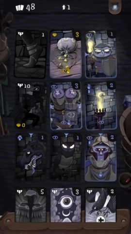 单人纸牌式的玩法,12张可解锁和升级的装备卡
