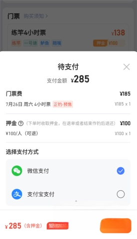 在钓点页面搜索到目标钓点后,就能进入购票界面,挑选对应的门票并提交订单。