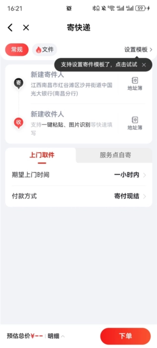 3、输入寄件人收件人形象以及取件时间后下单即可