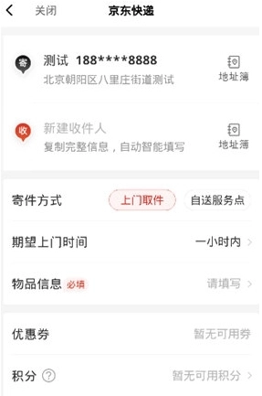 登录京东账号后,点击寄快递板块并根据需求选择不同类型,输入寄件人、收件人信息以及取件时间后下单。