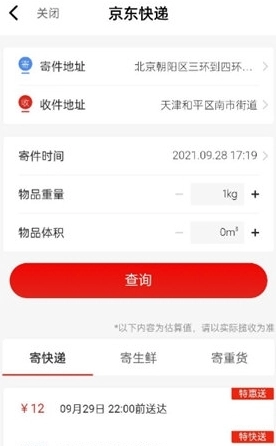 2、输入寄件地址、收件地址、寄件时间、物品重量、物品体积,点击【查询】。