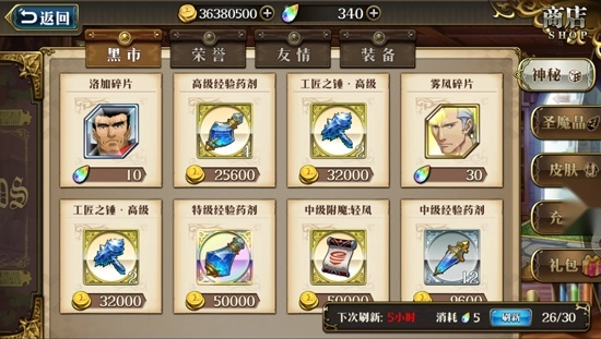在黑市中可以购买到很多养成相关的道具,需要花费一定的金币来购买。还可以花费少量圣魔晶购买英雄碎片。