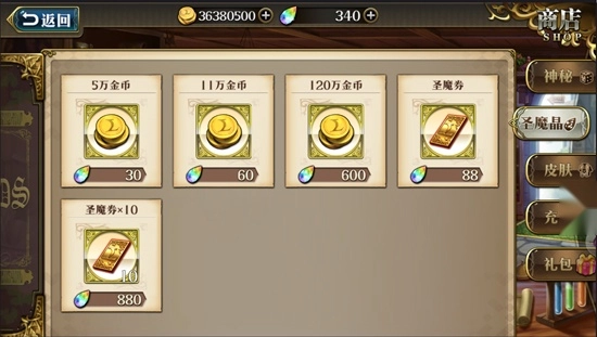 圣魔晶商店主要可以购买金币和圣魔券,需要发费圣魔晶购买。通过圣魔晶商店可以快速获得金币哦
