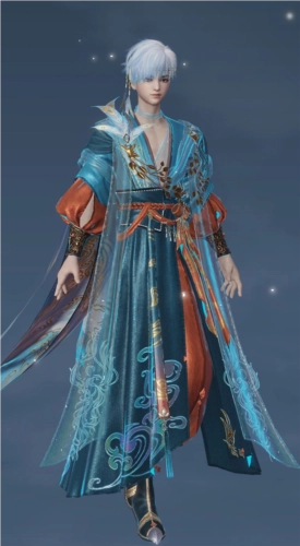 红品男装·霞掠云衿的设计元素以云为主导,并融合了青鸟与天空的特点。服饰以青鸟身披霞光送信为灵感,采用青、橙二色作为服饰主题色;开襟外装下是半透的轻纱披帛,好似青鸟在云雾间穿梭时勾连的云气。