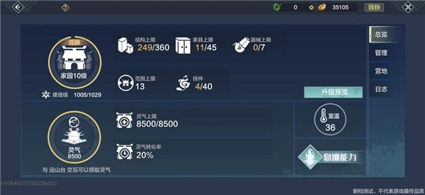 3、家园灵器远山台纳灵。日常获取灵气的方法。灵气转化速度和每次能获取的灵气上限均与家园等级有关。前期可以先把这个科技解锁,给的经验也是比较可观的。操作方法:靠近远山台——纳灵。