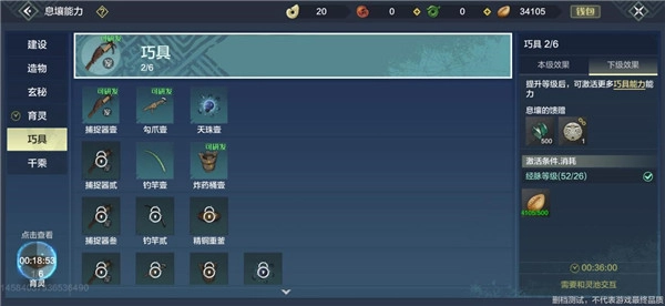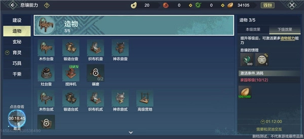 首先面前有六大分支,分别为建设、造物、玄秘、育灵、巧具、千乘,每条分支对应一条玩法,可谓是极大的丰富了生活玩家的可玩性。