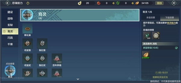 育灵主要是孵化元胎,培育花草,养殖鱼苗的功能。除了孵化巢之外,其他可以等到游戏中期再解锁。