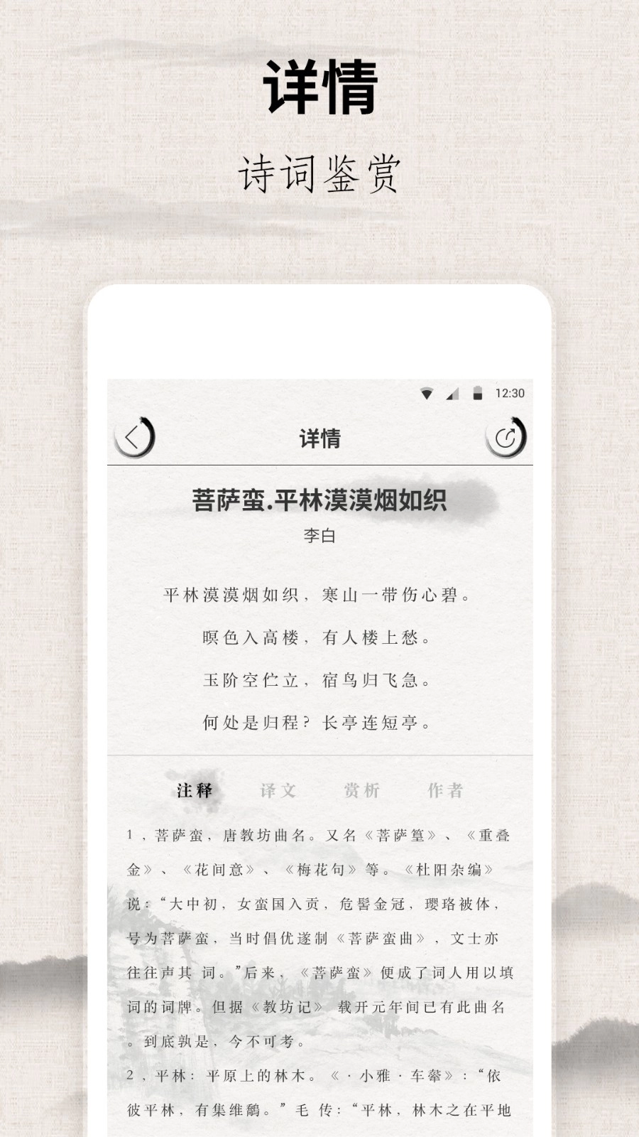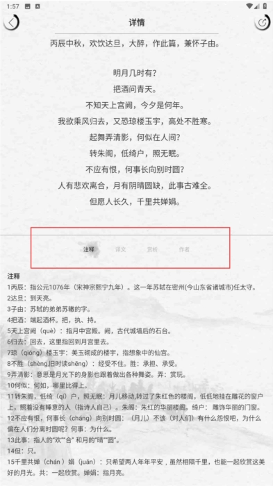 2、详情页可切换【注释】【译文】【赏析】【作者】,了解诗词信息。