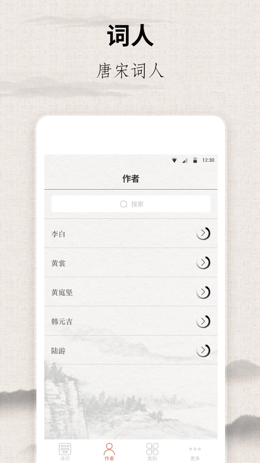 3、点击底部【作者】,进入作者列表,查看对应作者的诗词作品。