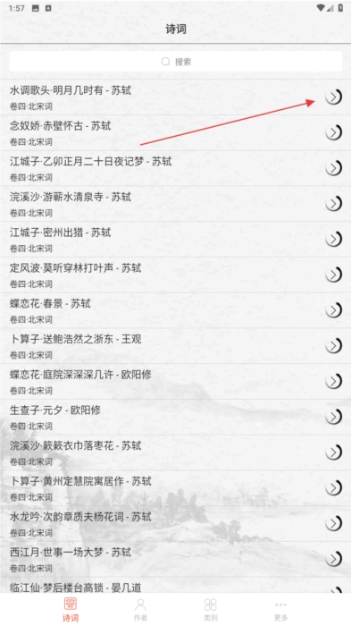 1、在“诗词”列表页,点击诗词右侧按钮,进入详情页查看内容。
