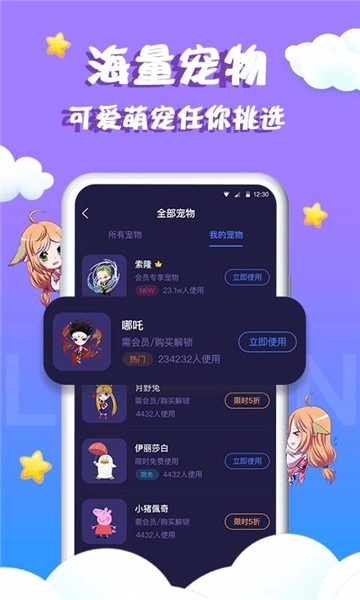 2、丰富的宠物形象角色,拥有小猪佩奇、伊丽莎白、哪咤以及索隆等角色;