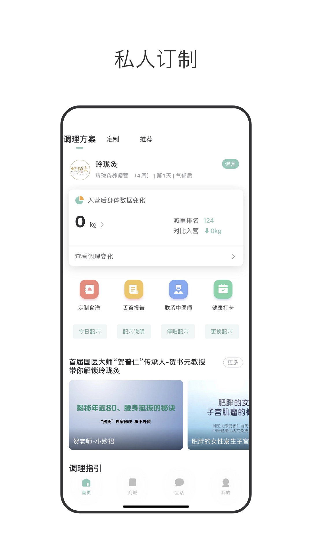 基于中医体质学说与现代营养学精准判断用户为气虚质、湿热质、痰湿质等9大体质类型并标注主要弱脏,根据测试结果推送包含饮食调整、运动计划及艾灸调理方案的专属健康建议,独创将艾灸与瘦身结合、通过特定穴位刺激加速代谢并以4周为周期拆分阶段性目标的玲珑4321灸瘦法帮助用户科学减重。