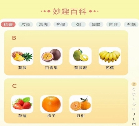 建立水果-营养素-功效的三维关联模型,用户可通过任意维度切入查询。